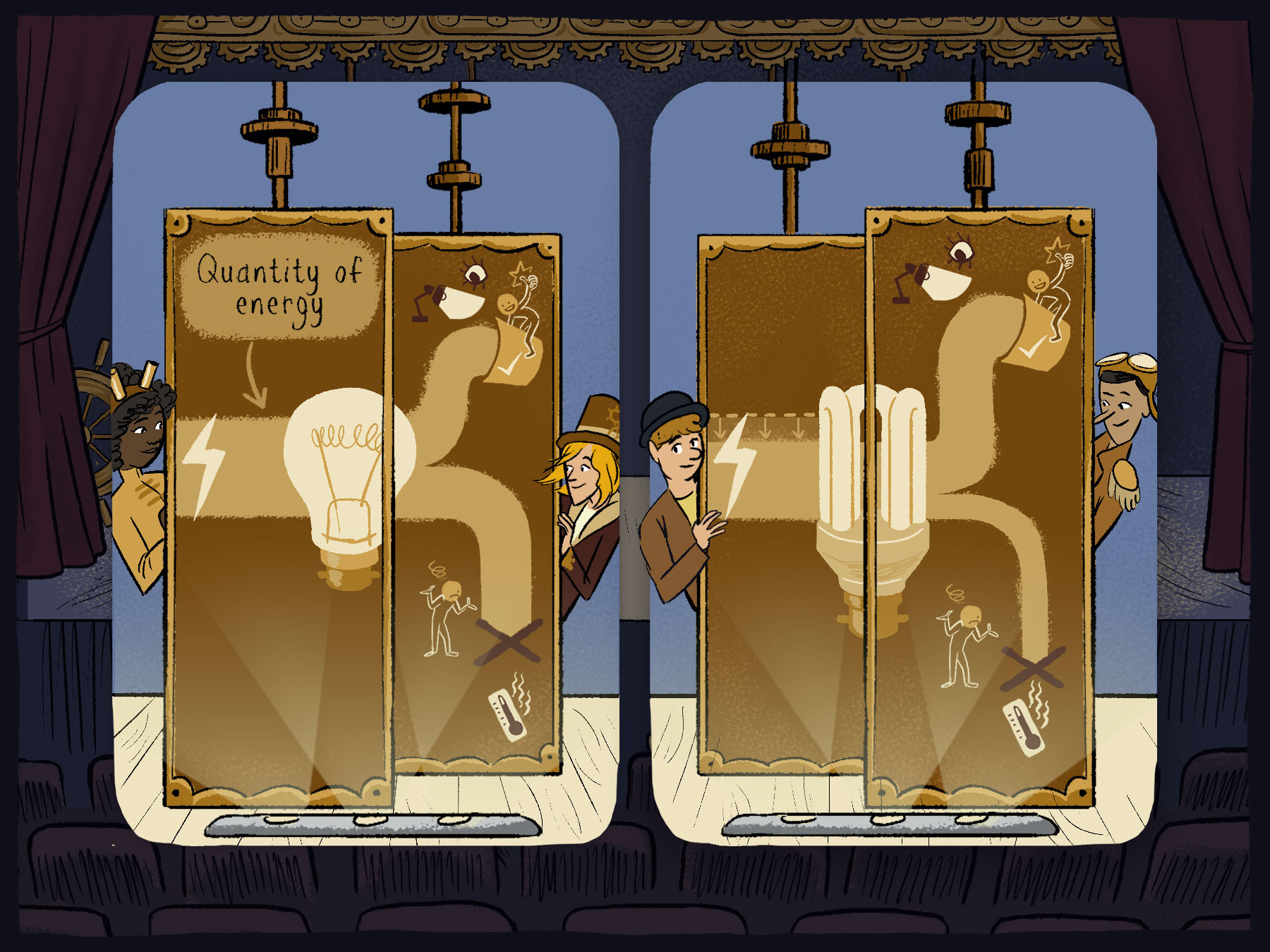 10. In order to represent the quantity of energy transferred in an energy chain, Sankey diagrams can be used. This is a type of flow diagram in which the width of the arrows is proportional to the flow represented. Sankey diagrams can be used to visualise, on the one hand, the energy input required to operate one or more systems (lamps, vehicles, heating, etc.). In other words, the distribution of the energy produced by the system(s) from the incoming energy (in particular, what is actually ‘useful’ for the operation of the system, and what results from a degradation of the incoming energy, referred to as ‘useless energy’). The Sankey diagram has the advantage of showing the quantities of incoming and outgoing energy and, in accordance with the principle of conservation, the sum of the widths of the incoming arrows must be equal to the sum of the widths of the outgoing arrows.